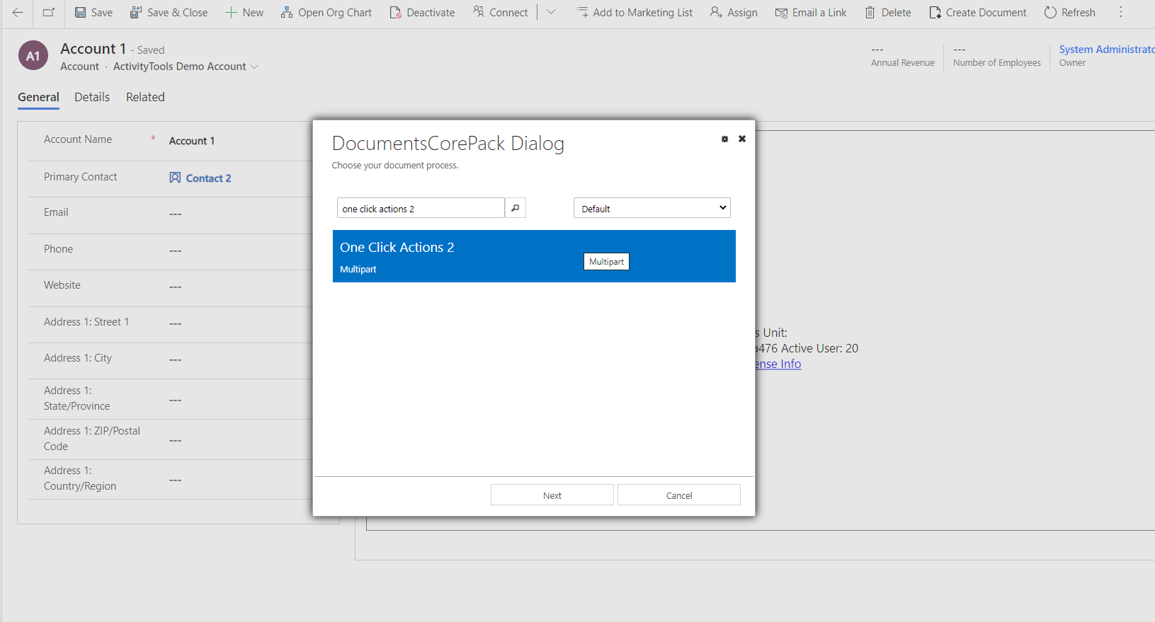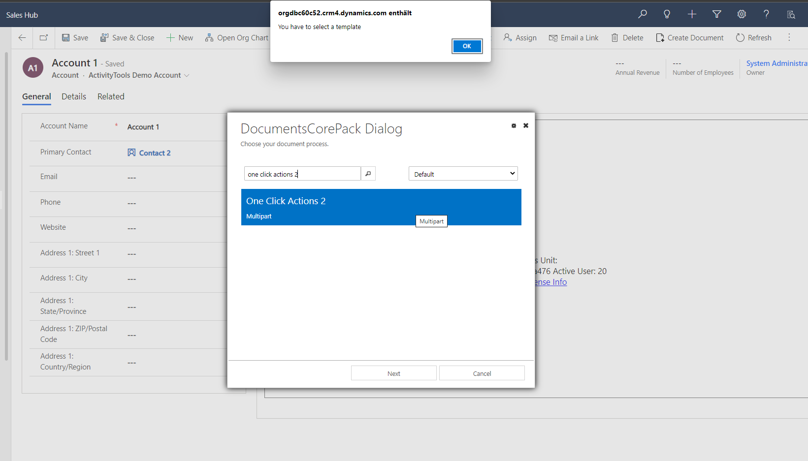 - Fixed an issue where OCAs that contained a condition based on a FetchXML (that includes the “uiname” property in the condition) within a Multipart were not working. The following behavior occurred in the dialog:
