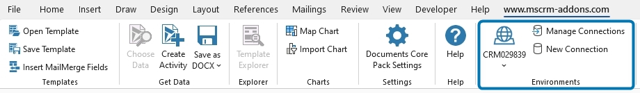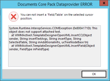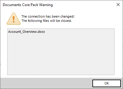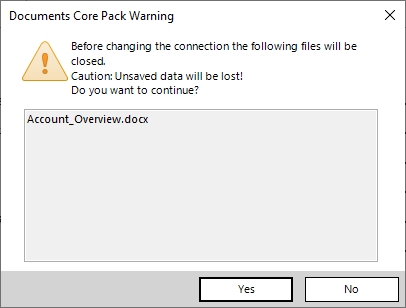 - Changing Connection: If you are trying to change the connection via the DocumentsCorePack Template Designer, a message will warn you that, in case you have a Word template file open, your template will be closed unsaved if you continue. If you already changed the connection via the DataProvider, the template will be closed unsaved regardless.